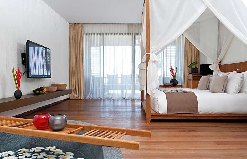BEACH FRONT is 721 square feet and includes a king-size bed 150-183 width plus safe, bathrobes, and slippers.
